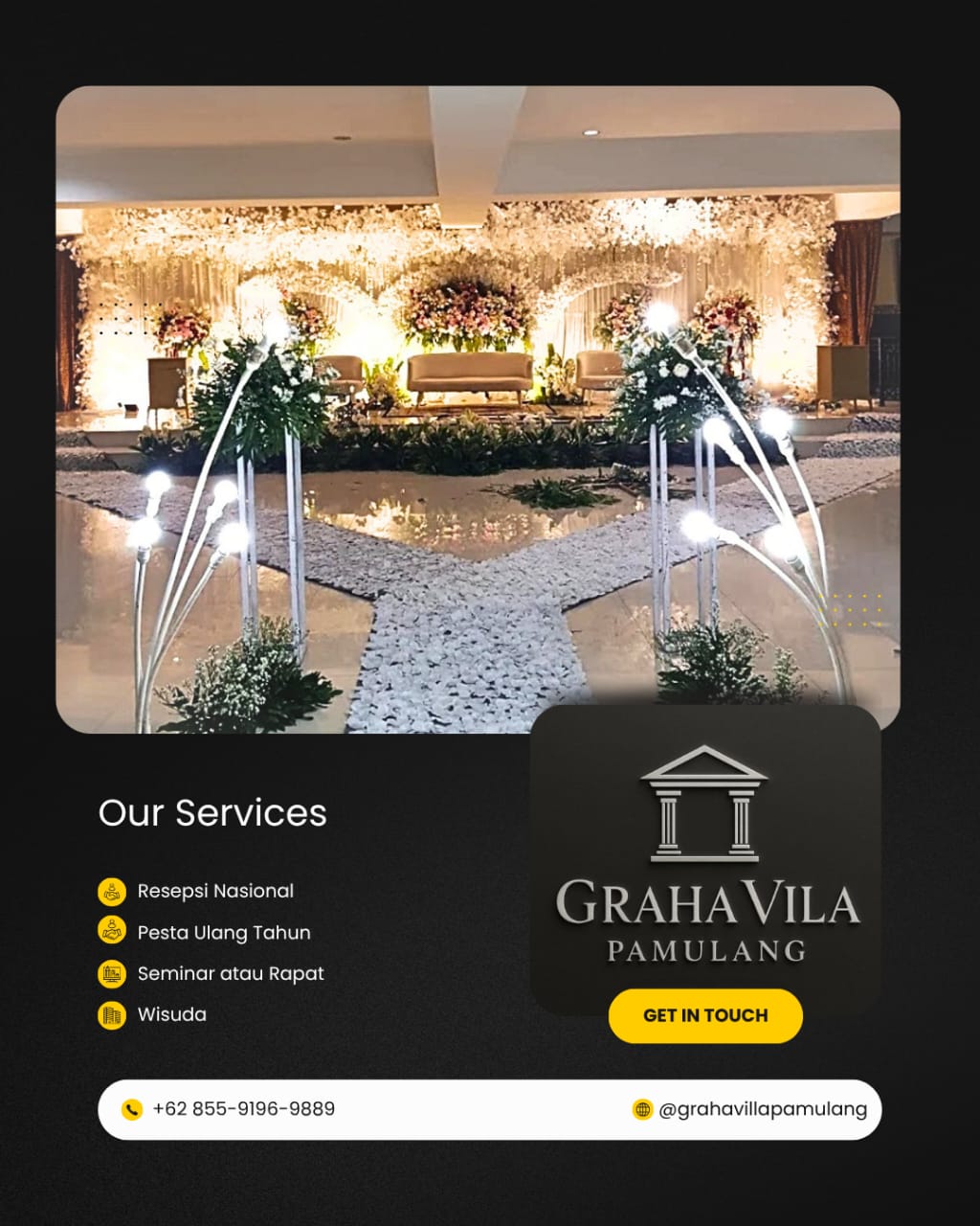 Venue kami dirancang untuk menyediakan ruang ideal bagi momen-momen paling berkesan — mulai dari pernikahan dan seminar hingga perayaan keluarga dan acara pribadi.